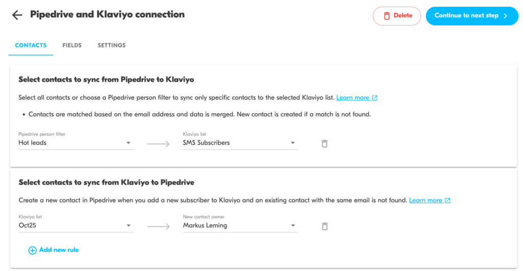 Our Pipedrive-Klaviyo integration also syncs contacts bi-directionally between the apps. It also syncs sends, opens, clicks, bounces, and unsubscribes automatically over to Pipedrive.