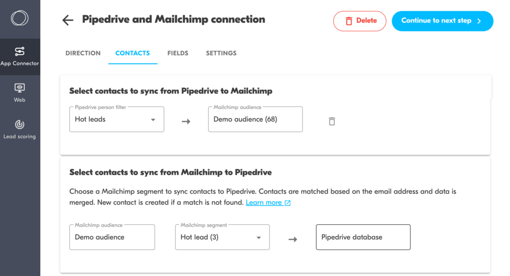 This means that while you can export contacts from Pipedrive to Mailchimp, you can’t simultaneously push information like opens and clicks from Mailchimp back to Pipedrive. Furthermore, it’s impossible to sync organization or deal fields and prevent duplicate contacts in MailChimp if the email addresses change on Pipedrive.