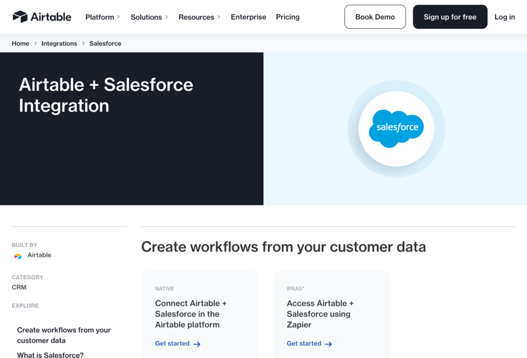 Airtable offers a built‑in sync integration with Salesforce (available for Business and Enterprise/Scale plans), which lets you import data from Salesforce reports directly into an Airtable base as a new synced table. This is a one‑way sync — you can’t push changes from Airtable back into Salesforce.
