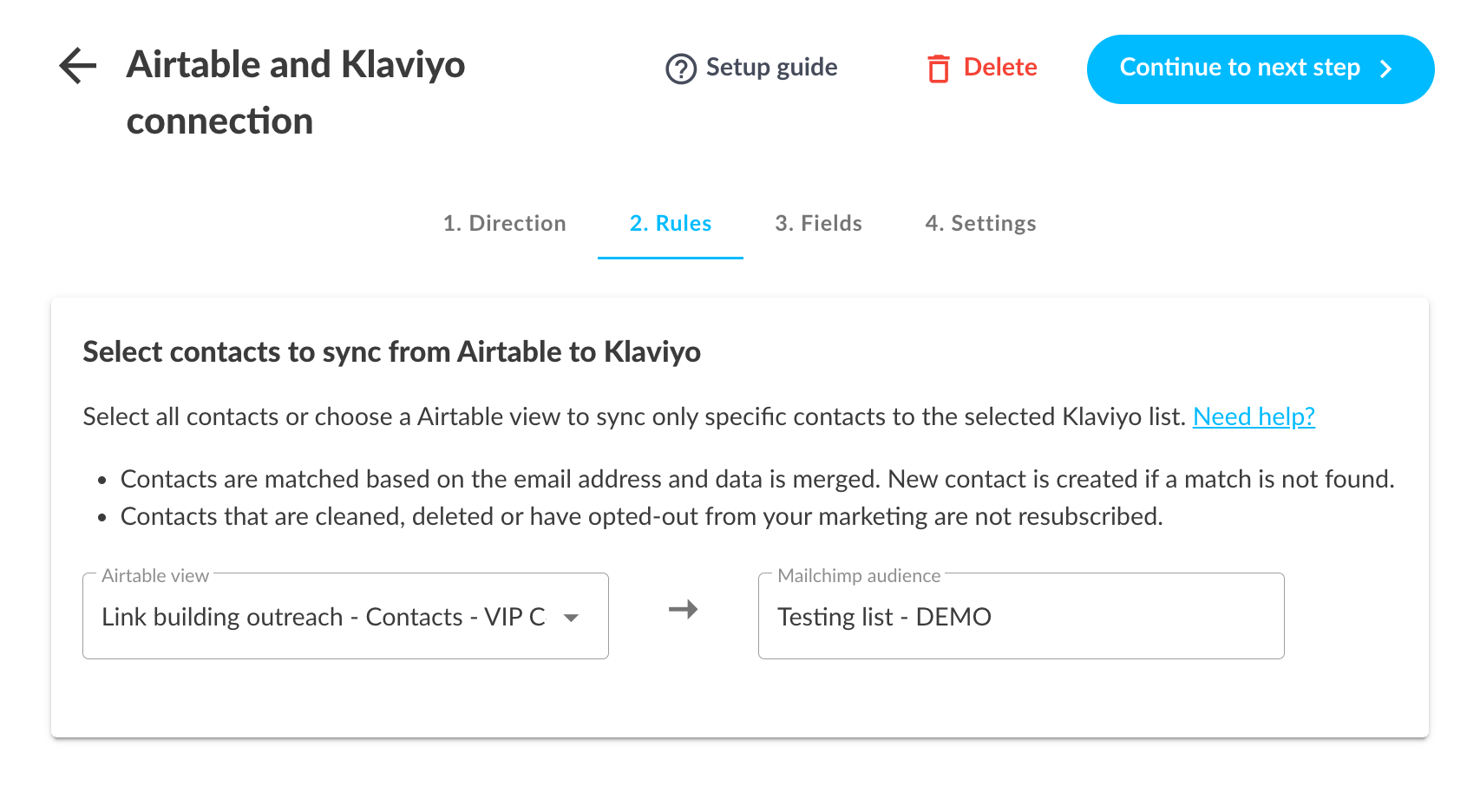 Sync new Klaviyo subscribers or only those who engage with your campaigns to Airtable as contacts.