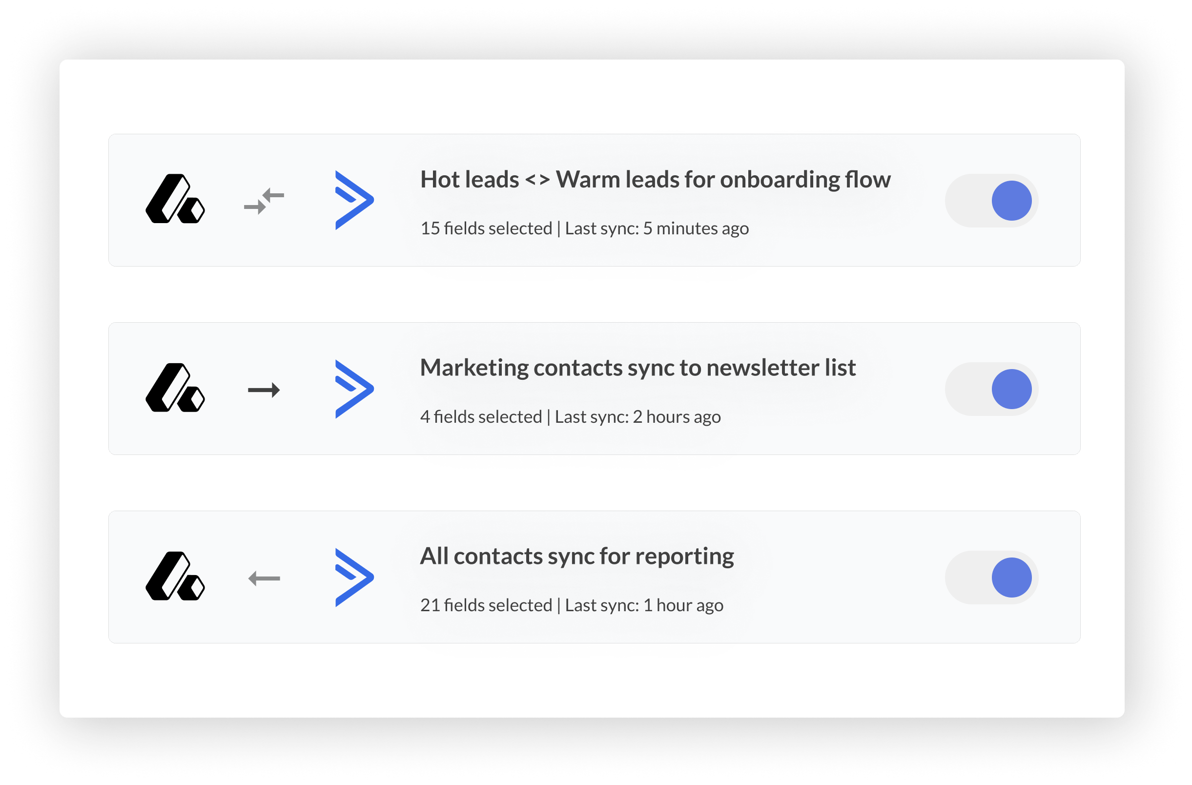 - Sync exactly what you need. Choose all contacts or specific segments for each sync. Map which contact and company fields stay in 1-way or 2-way sync.