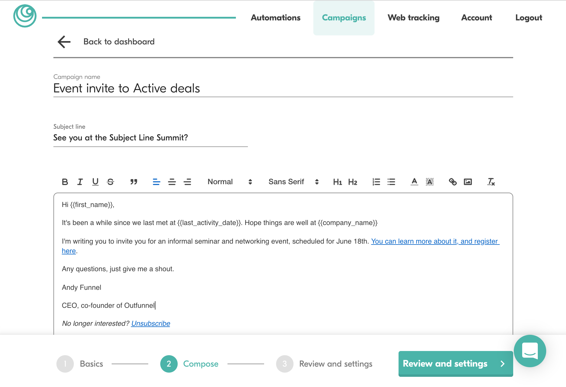 Send automated campaigns or one-off emails to segments defined in Copper with tags, Contact Types or Lead Statuses.