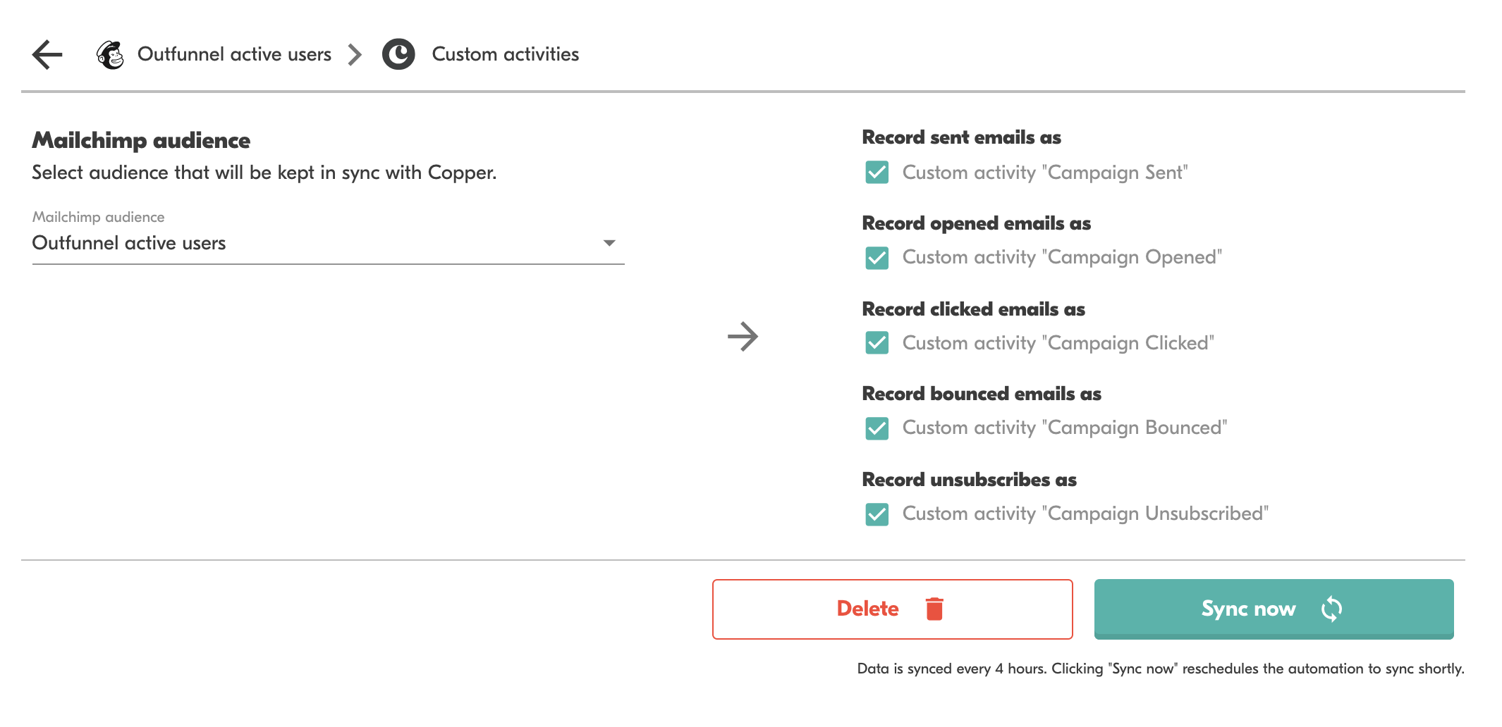 Mailchimp sends, opens, clicks and unsubscribes are recorded in Copper.
