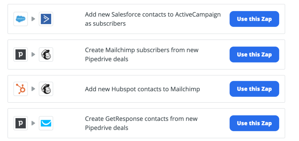 Zapier and its alternatives like Outfunnel and Make (previously Integromat) are some of the data connectors that offer integrations between CRMs and marketing tools.